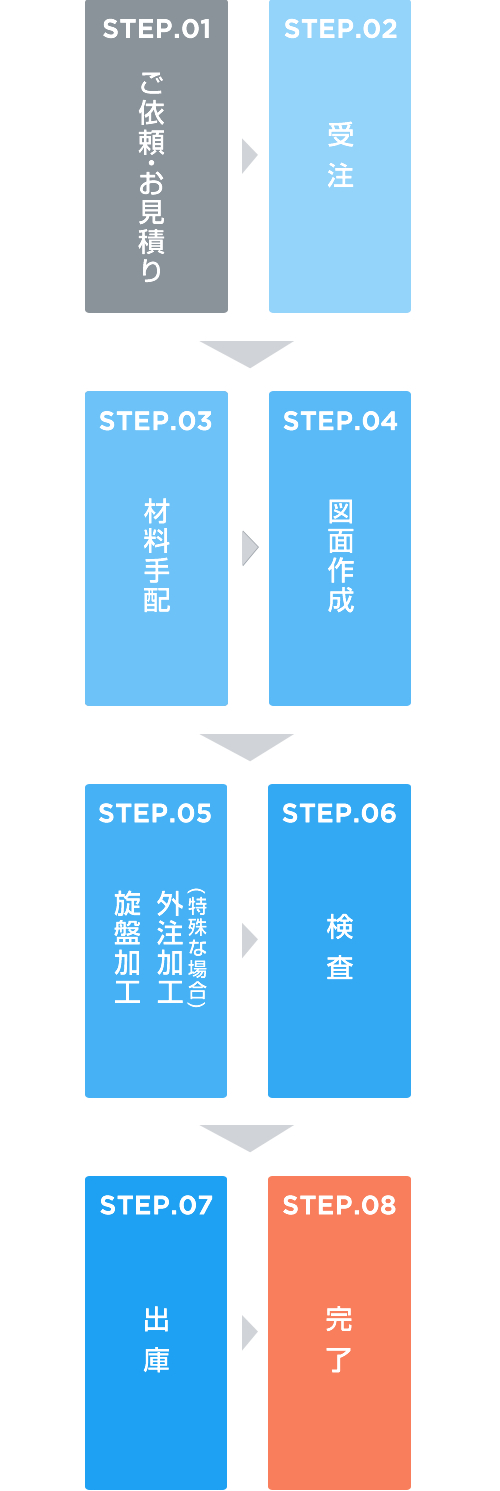 あらゆる見積もり、相談に関してまずはお電話・FAX・メールでのコンタクトを頂いた後に仕様や寸法詳細の確認及び打ち合わせを行います。規格が不明な場合や詳細が確認できない場合でも弊社からご提案やアドバイスが出来る場合も御座いますので曖昧な見積もりの場合でもまずはお気軽にご相談下さい。